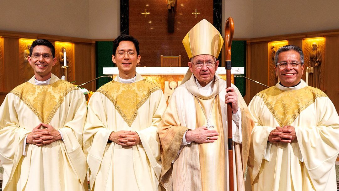 The Most Reverend José Gomez, Archbishop of Los Angeles, ordained three Jesuits at American Martyrs Catholic Church in Manhattan Beach, California, on June 14: Fr. Dominic Chai, SJ, Fr. Ulises Covarrubias, SJ, and Fr. Fernando Saldivar Jr., SJ.