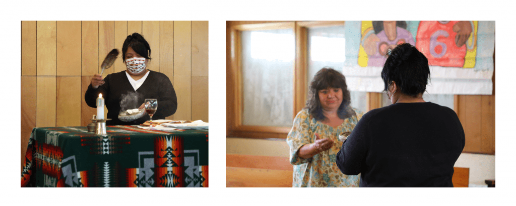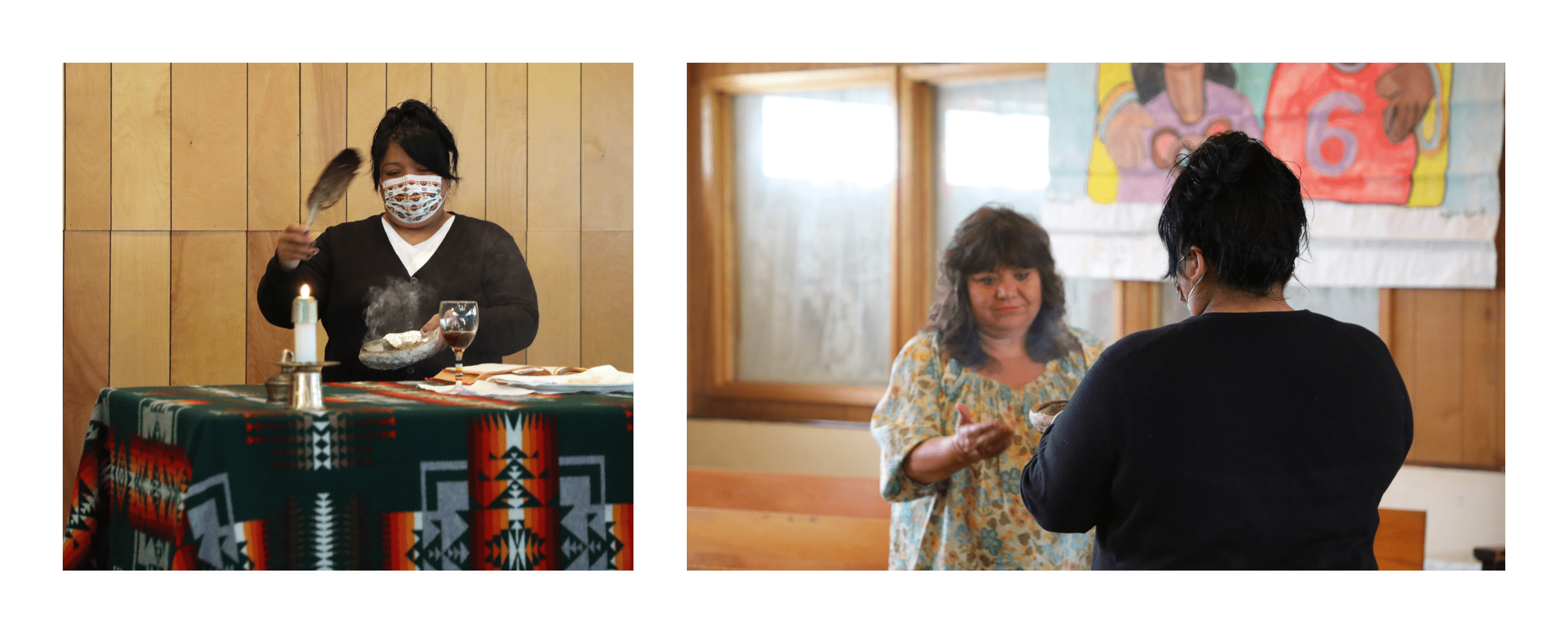 At Sacred Heart, Mass is suffused with Native ceremony and music. Before the Eucharist is consecrated, a parishioner (typically an elder) smudges the host and the altar with a smoking bundle of sage. Smudging is an Indigenous practice in which plants such as sage and cedar are burned, creating a smoke to cleanse the spirit. After cleansing the altar, the elder traverses the pews wafting smoke over each parishioner. At the end, the parish sings a hymn in a Salish dialect.