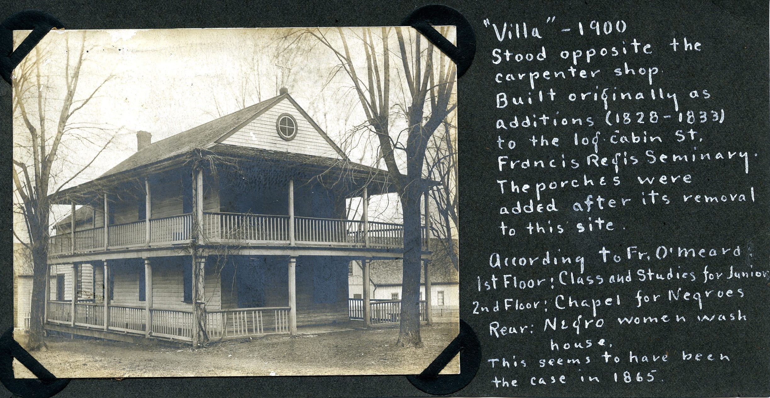 The Jesuits forced their enslaved people into lives of arduous labor and struggle, and yet Augustine and his family members found ways to resist their enslavement by building and maintaining networks of kinship and community. With his family, Augustine attended services at St. Ferdinand Parish in Florissant, where he received his first communion in 1836 and was confirmed on May 3rd of the same year alongside Peter Hawkins. Both boys received a cap, pantaloons, a jacket, and vesting to wear for their First Communions. With his family, Augustine enrolled in several religious associations at St. Ferdinand, including the Confraternity of the Rosary. Worship services provided enslaved people in Florissant time off from labor to gather socially and spiritually. After their long hours of unrequited labor, many worked late into the night to earn money they could use to buy fabric to dress in their finest clothing when they gathered for Mass on Sundays. When Augustine was twenty, his relative Elizabeth Queen chose him as a witness to her marriage to Allen Harris. By 1849, Jesuits converted the second floor of a building at Saint Stanislaus into a chapel for enslaved people. Though this limited how often the families at Saint Stanislaus could join their enslaved and free neighbors at St. Ferdinand, people of color built shanties in the woods near the Jesuits’ property in order to be closer to the families enslaved to the Jesuits and attend services with them.