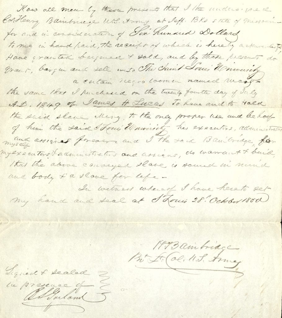 Knowing that Bainbridge’s military duties had him frequently on the move, Mary, Augustine, and Augustine’s Jesuit owners feared that the couple would be separated should Bainbridge move or sell Mary. Accordingly, on December 11, 1849, the Jesuit Consultors of the Missouri Vice-Province decided to purchase Mary in order to keep the family together. The money they used to purchase Mary, however, had been obtained from the proceeds of tearing another family apart by sale.