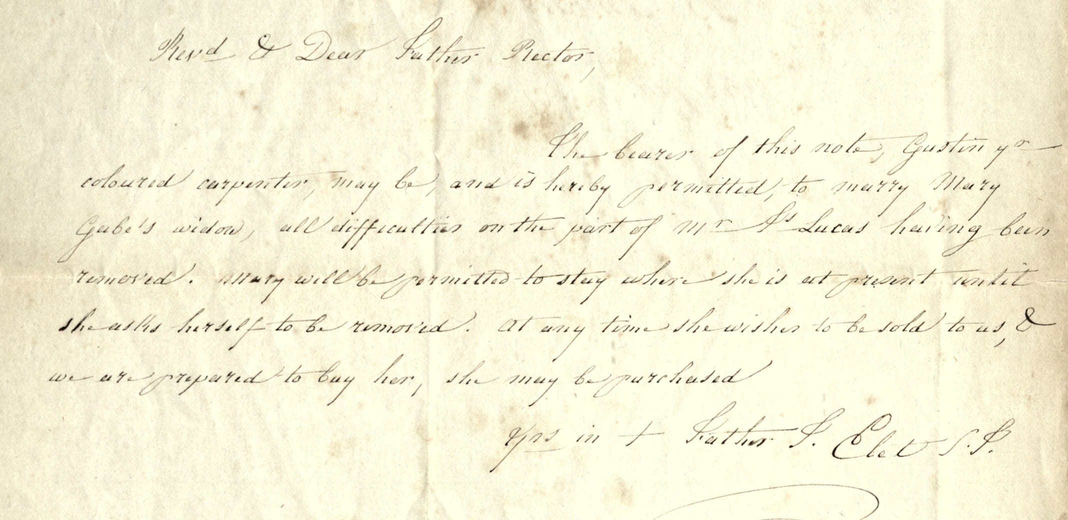 The bearer of this note, Gustin, yr coloured carpenter, may be, and is hereby permitted, to marry Mary, Gabe’s widow, all difficulties on the part of Mr. Js Lucas having been removed. Mary will be permitted to stay where she is at present until she asks herself to be removed. At any time she wishes to be sold to us, & we are prepared to buy her, she may be purchased."