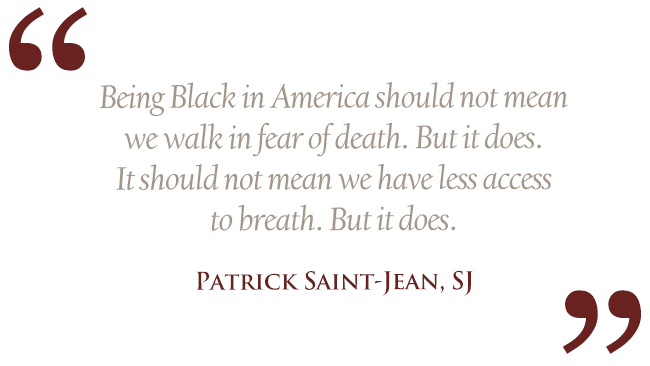 June 1, 2020 — “As a black man living in America, the video of George Floyd’s suffocation cues unhealed experiences with police in this country and makes me less optimistic that change between the Black community and the police will soon change,” writes Patrick Saint-Jean, SJ, for the Jesuit Post. “Being Black in America should not mean we walk in fear of death. But it does. It should not mean we have less access to breath. But it does.”